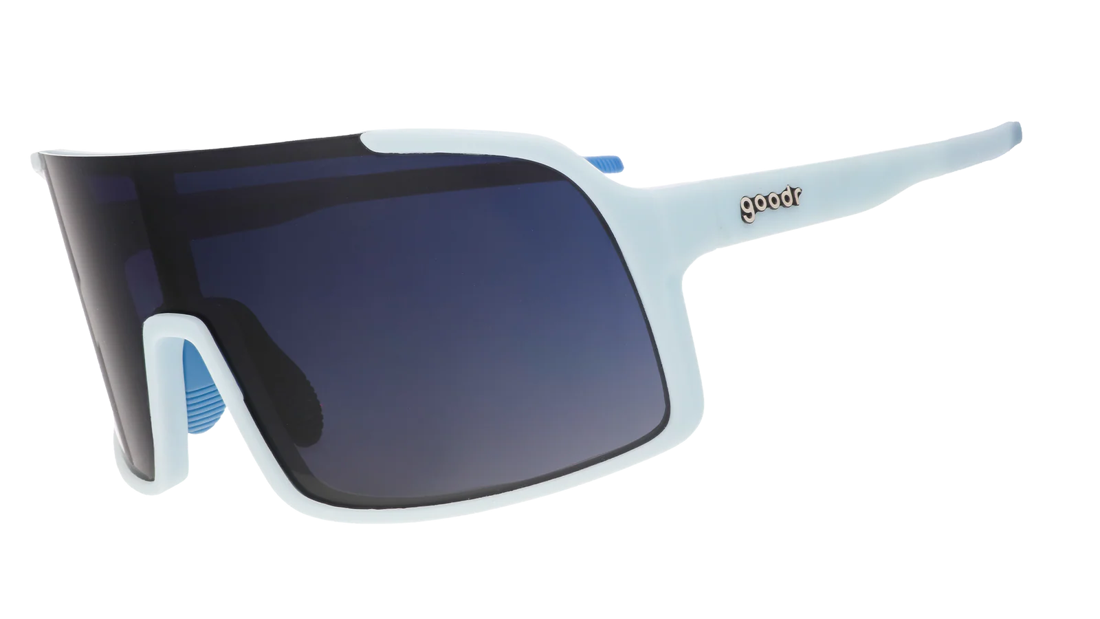 Semi-rimless, blue shield frames. Polarized gradient lenses reduce glare from the sun shining on your kidnapper's metallic exoskeleton. Won't slip or bounce while you desperately try to escape your cyborg captors. (P.S. Resistance is futile.)