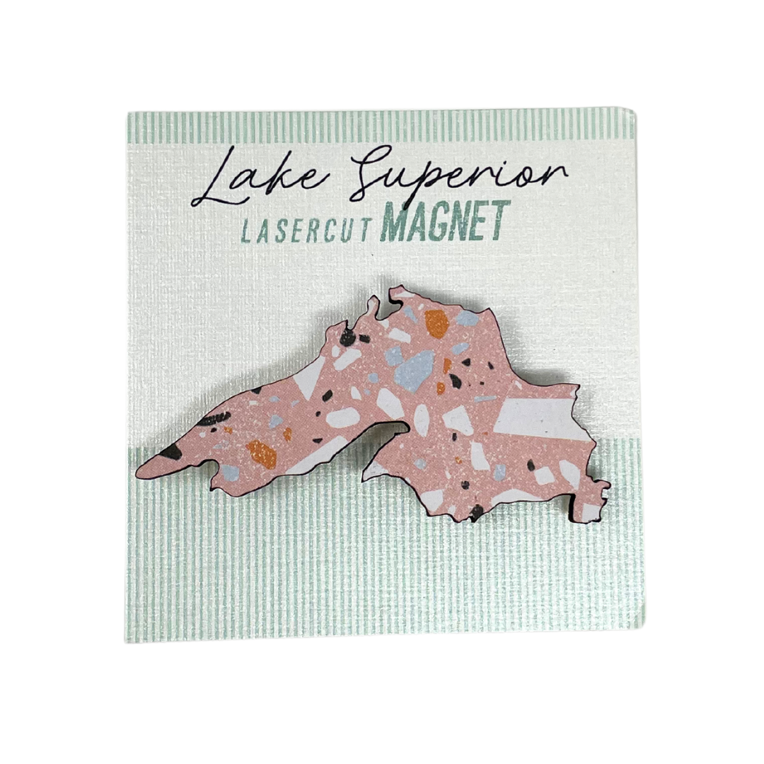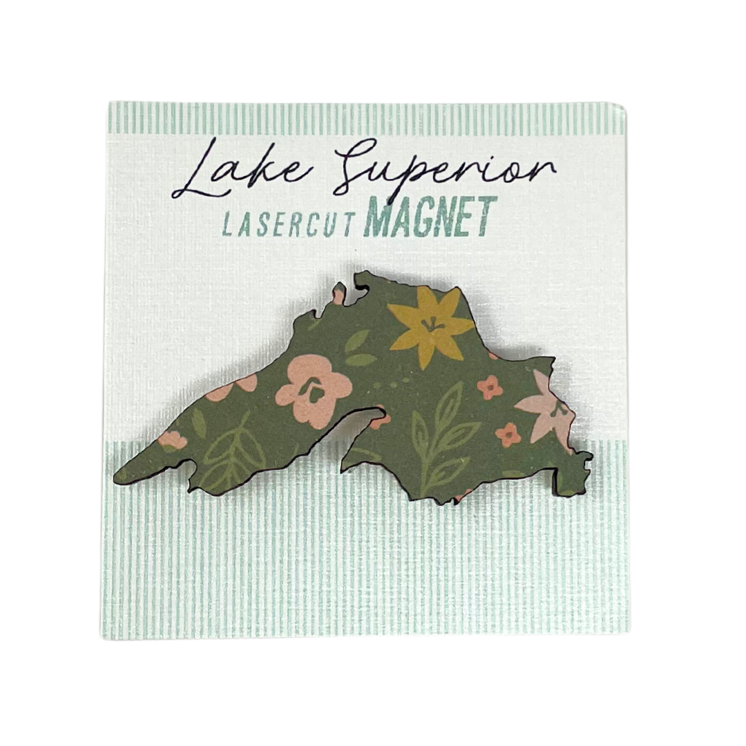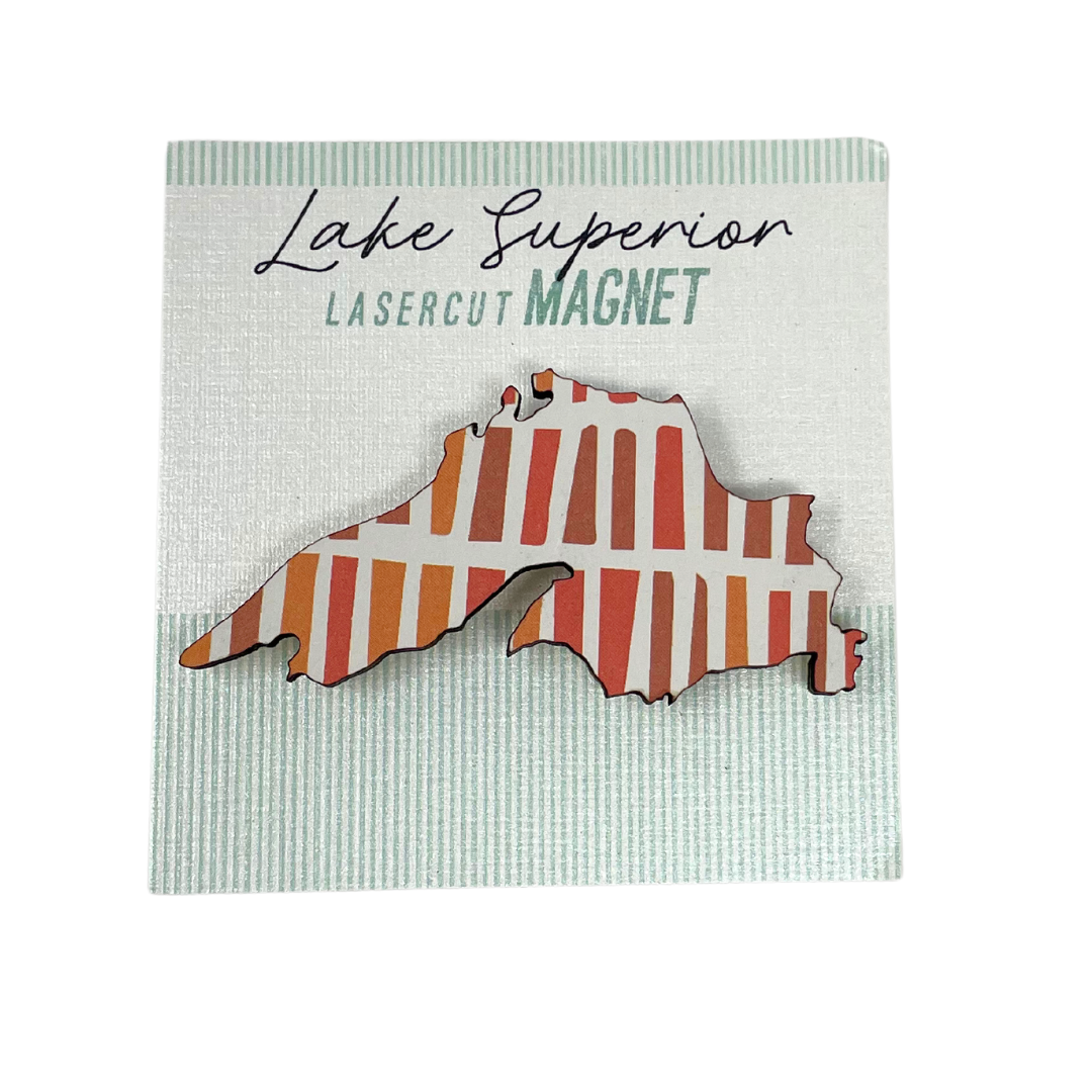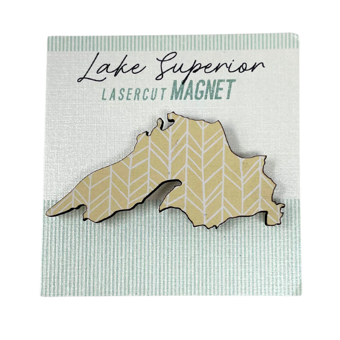 Lake Superior Laser cut Magnet. They each have strong magnets on the back and are packaged with a back card in a 3x3" zipped bag.